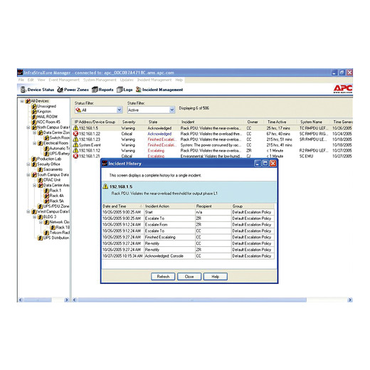 Notification and event analysis for managing network-critical physical infrastructure (NCPI). Increase confidence of your NCPI availability by adding the Incident Management Module to your APC InfraStruXure® Manager. The added module enables quick and easy identification of the physical location and logical impact of a problem, and identifies the owner of the problem resolution. It helps establish and confirm a policy appropriate to your organization, ensuring the right people are notified for fast problem resolution, and prioritizes the urgency level of the incident accordingly. The Incident Management Module enables you to take proper corrective actions to return to the normal service level quickly, with minimal impact on business activity.